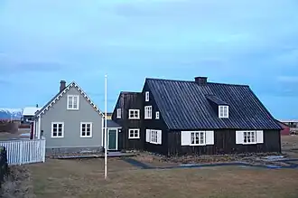 Fishing became a more important occupation after 1855 when the Danish–Icelandic Trade Monopoly was abolished and patterns of settlement changed greatly.[3] The village's heyday was from the mid-19th century to the early 20th century but with improved public transport and occupational opportunities the number of inhabitants decreased. Because of that, many houses from 1890 to 1920 have been preserved; those little houses of the common people characterize the village.[6][7] Not far from the Folk Museum is the church (1890) where the altarpiece is worthy of notice. It is given and painted by the Danish queen Louise of Hesse-Kassel.[8]