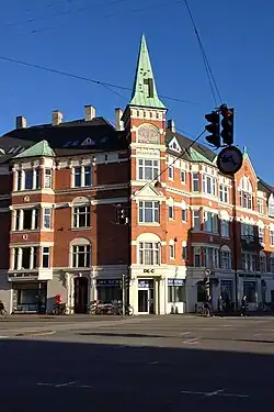 The Functionalist apartment building Trekanten ("The Triangle") on the rounded corner of Åboulevard and Rosenørns Allé was designed by Kay Fisker.[3] In collaboration with C. F. Møller, Fisker also designed the neighbouring housing estate, Hermanhus, which consists of two buildings surrounding a greenspace called Hermann Triers Plads ("Hermann Trier's Square"). The bay windows are typical of his Functionalist style. The buildings were listed in 1981.