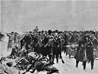 The bulk of the army marched out the next day, during a blizzard, with the battalions formed into squares in which the baggage and sick soldiers were escorted. A lot of supplies, provisions and sick soldiers were left behind due to the lack of horses. The Russians advanced rapidly during this time; a cavalry attack by Yakov Kulnev was repulsed by the Swedish rearguard-division.[4] However, the Södermanland battalion at Signilskär (475 men) and 87 Fleetwood jägers who were ordered to fight a delaying action, were cut-off and forced to surrender.[5] On 18 March, the bulk of the Swedish forces reached Grisslehamn on the Swedish mainland after having marched for 45–50 km (28–31 mi).[4]