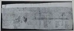 Æthelred also reached an agreement with Ælfred, an ealdorman, where Ælfred was granted the life use of a Canterbury estate in return for bequeathing one of his estates to Canterbury after his death. The document that records this agreement is not dated, however, so it is unknown when exactly during Æthelred's episcopate the document was drawn up.[2] Another problem for the archbishop was a decline in the abilities of the scribes at Canterbury, which is dramatically illustrated by the document, which has a number of errors and duplications. Other documents of the period show that some of the scribes had little knowledge of Latin.[7]