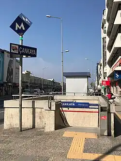 Çankaya is an underground station on the M1 Line of the İzmir Metro in Konak. Located beneath Fevzi Paşa Boulevard, it is one of the ten original stations of the metro system. The architecture of the station consists of a main hall with a high ceiling, with mezzanines on both sides. The only other station to share this architecture is Konak. Connection to ESHOT city bus service is available above ground. Service began on 24 March 2018, connection to the Konak Tram also became possible via Gazi Bulvarı station. Çankaya station is located near the northern entrance to the historic Kemeraltı marketplace.