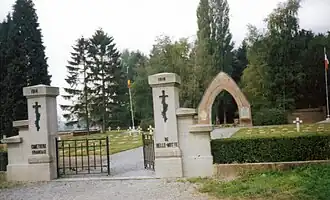 This military cemetery contains the graves of 4,057 French soldiers, the largest concentration of French graves on Belgian soil. In the centre of the cemetery is an arch in the gothic style and inside the arch is a bronze relief by Élie Le Goff depicting the profile of Ernest Cotelle whose sons Georges and Henri gave their lives in the 1914–1918 war and are buried here at Belle-Motte. From 1919 to 1934, Professor Cotelle had given lectures at Belle-Motte.[23]