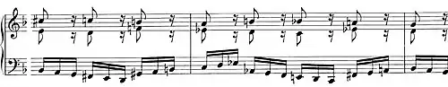 Like all of Chopin's other études, this work is in ABA form though the B section does not represent a contrasting and independent middle section in the manner of a trio.[5] The entire piece is based on the same semiquaver motif, which springs from its opening strong sforzato accent to rapidly increase its volume and compass until ending abruptly on a strong sforzato climax.[6] Musicologist Hugo Leichtentritt (1874–1951) presents a graphic curve which illustrates the aggressive character of the motive expanding from second to eleventh in less than three bars.