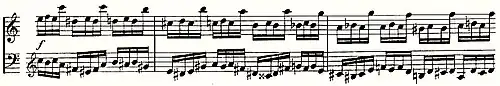 In Robert Schumann's 1836 Neue Zeitschrift für Musik article on piano études,[15] the study is classified under the category "speed and lightness" [Schnelligkeit und Leichtigkeit]. Collet remarks that the procedure of transferring the semiquaver figuration from one hand to the other, common in Bach but rare in Chopin, "makes great demands on the left hand." Chopin [in other works] rarely treats the left hand "as if it were a second right hand."[16] Chopin's zigzag configuration of the semiquaver line hardly allows usage of the standard C minor scale fingering and invites pianists to use their thumb on black keys, treating them just like white ones. The result is a general absence of finger crossings, thus facilitating a quicker tempo. French pianist Alfred Cortot (1877–1962) states that the main difficulty to overcome is "regularity and briskness of attack" and the [very quick] alternation of narrow and wide hand positions.[17] His preliminary exercises commence to address the narrow and wide positions separately.