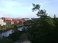 The tall buildings of Handen commercial centre along the eastern shore of the lake contrast the dense forest of the Rudan Open-air Area on the opposite shore. The proximity to the commuter rail station at Handen, makes the lake easily accessible to a large number of people, while the forests surrounding it makes it attractive to open-air lovers. It is used for bathing in summers and cross-country skiing in winters.[4]