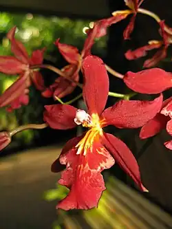 × Odontioda is a nothogenus of hybrid orchids, for plants produced by crosses between the genera Odontoglossum and Cochlioda. Typically they prefer intermediate temperatures, i.e. warmer temperatures than the mostly cool to cold growing parents, and indirect sunlight.[1] Often Cochlioda noezliana (Oncidium noezlianum) is a parent that inherits orange or red color.