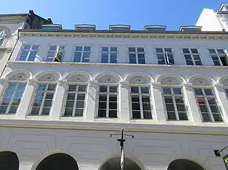 Østergade 24 is a three-storey building. The tall first-floor windows are topped by arched niches with stucco ornamentation. The facade is finished by a dentillated cornice.[33]