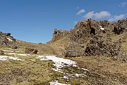 It also built up a meltwater lake that Pedersen et al. define as “a pillow-dominated flat-topped tuya without a lava cap”.[7] H. Björnsson explains that though the mountain is crossed by many faults and a graben, so that it looks like a complex formation, its origin is in a single eruption.[6]
