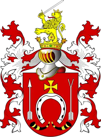 According to Długosz: red, a horseshoe argent, silver horseshoe pointing downwards, surmounted of a golden cross pattée; on the right, a silver arrow in a pale, on the left, an arrow with a pall pointing downwards; in the crest, a golden half-leaf in a crown with a sword in its right paw.[3]