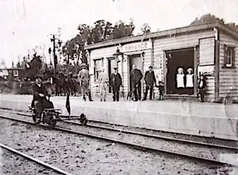 By 20 March 1908 there was a passing loop for 48 wagons. In 1980 it was extended to an 82 wagon capacity.[4] In 1910 a large timber mill and siding were built.[7] Traffic in 1911 averaged 6 wagon loads a day.[8] from 5 nearby sawmills,[9] which cut matai, rimu and kahikatea.[10]