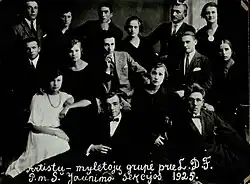 A socialist, Andrius Domaševičius actively participated in organizing workers' trade unions and other workers' activities.[2] In 1924 he established the Šviesa Artists' Society. The society also had chapters in Ūta,[3] Biržai, and Naujamiestis.[4] Although Domaševičius was its chairman, the society was headed by electrician J. Tarvydavičius, and later by actor Stasys Petraitis.[3][4] The society acted out various plays, such as Marat,[3] Tadas Blinda, Oscar Milosz's Two Brothers, Konstantinas Jasiukaitis's Alkani žmonės (Hungry People), Penktas įsakymas (The Fifth Order) and others.[4] The society also had an orchestra, which was headed by Koveris and later by P. Rutkauskas.[3] The members also would recite Julius Janonis's poems.[4] On 17 February 1925, along with the Panevėžys Workers' Trade Union, the society (then referred to as the Panevėžys Workers' Drama and Music Society „Šviesa“; Panevėžio darbininkų dramos muzikos draugija "Šviesa") was erased from the official society register.[5] After the 1926 Lithuanian coup d'état, the society was fully dissolved.[3]