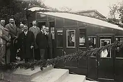 Upon the city council decision to improve the communication between the Žaliakalnis neighborhood with city center,[2] the funicular was constructed by engineering firm Curt Rudolph Transportanlagen from Dresden, Germany with electrical equipment from AEG and mechanical parts from Bell Maschinenfabrik, Switzerland. The official opening was on 5 August 1931 with one passenger car, while the second car was only a platform ballasted with stones used to counterbalance the passenger car. The electric overhead power cable and the pantographs of the coaches are only used for lighting and heating of the cars. The upper station housed the electrically driven funicular mechanism in the basement, whilst the lower end of the line did not even have a shelter until 1932.[3]