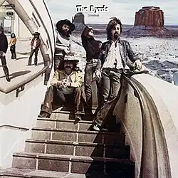 The album cover artwork was designed by Eve Babitz and featured photographs taken by Nancy Chester of the Byrds upon the steps of Griffith Observatory in Los Angeles, with the view of L.A. that originally made up the background being replaced by a desert scene.[8][26][31] When the double album gatefold sleeve was opened up, the front and back cover photographs were mirrored symmetrically in a style reminiscent of the work of graphic artist M. C. Escher.[8] The inside gatefold featured four individual black & white photographic portraits of the band members, along with liner notes written by Jim Bickhart and Derek Taylor.[8]