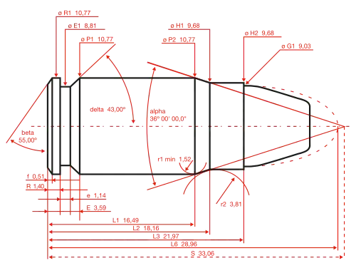 Several sources have published contradicting information regarding .357 SIG headspacing.[8] This is due to the cartridge having been originally designed as a .357 (9.02 mm) round, but then rapidly adapted to the .355 (9 mm) bullet. According to the official C.I.P. (Commission Internationale Permanente Pour L'Epreuve Des Armes A Feu Portatives) 2008 revised documents, the .357 SIG headspaces on the case mouth (H2).[9] Some US sources are in conflict with this standard.[10] However, the cartridge and chamber drawing in the ANSI/SAAMI American National Standards also clearly shows the cartridge headspacing on the case mouth.[11] Likewise, US reloading supplier Lyman has published that the .357 SIG headspaces on the case mouth.