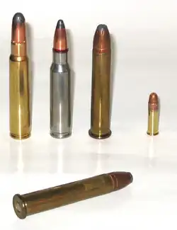 ![]() Foreground: .375 Winchester. Left to right: 8mm Mauser, .308 Winchester, .375 Winchester, .22 Long Rifle. | ||||||||||||||||||||