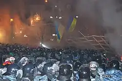 At 1:33 a.m. Andriy Shevchenko informed the protesters that Berkut forces were going to break the barricades from the side of Mykhailivska Square.[5][6] Violent fights occurred in the Square as the Berkut started destroying the barricade on Instytutska Street, and Titushky started plundering the camp. Although the government concentrated a large number of security forces around the square, protesters did not give up and their number eventually grew. Berkut used tear gas on the protesters and the clouds of smoke were visible over the crowd as reports about arrested and injured people, including MPs, were being aired in the news. Calls for the mass mobilization of Kyiv citizens to the Maidan were spread and many people responded to the call.[7]