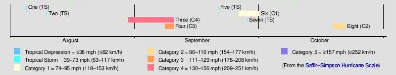 | Eight | October 19–22 | Category 2 hurricane | 105 (165) | 996 | Southeastern United States | Unknown | None | |||