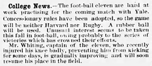 - ^ "Foot Ball.—The Match Between Harvard And Yale – Harvard Victorious". Boston Evening Transcript. Boston, Massachusetts. November 15, 1875. p. 1. Retrieved March 29, 2022 – via Newspapers.com