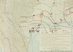 Surface weather analysis of the hurricane on September 16, 1875, nearing landfall in Texas at peak intensity