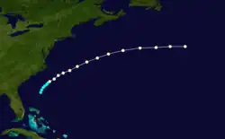 The brig Belle of the Bay encountered a severe gale north of the Bahamas on September 24.[25] Consequently, the track listed in HURDAT begins that day as a tropical storm approximately 275 mi (445 km) east of Jacksonville, Florida. The storm moved slowly northeastward and intensified into a hurricane with maximum sustained winds of 80 mph (130 km/h) on September 25,[7] based on reports from the ships R.A. Allen and Sedmi Dubrovacki.[4] By September 27, the hurricane curved east-northeastward and was last seen on the following day roughly 555 mi (895 km) to the southeast of Cape Race, Newfoundland.[7] The reanalysis study by Chenoweth argued that this storm instead formed over the central Atlantic on September 22. He also proposed that the system moved around Bermuda and later passed through the Azores before becoming extratropical on September 30.[6]