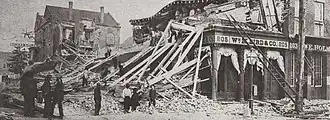 Within the city, many of the buildings sustained damage; some had to be torn down and rebuilt. The most prominent damage was done to buildings constructed out of brick, amounting to 81% of building damage. Buildings that had a wood frame suffered significantly less damage. Another factor that affected the percent of buildings destroyed was what kind of ground these buildings were built on. Buildings constructed on made ground were significantly more likely to be damaged than buildings constructed on solid ground; however, this relationship only occurred in wood-frame buildings, with 14% of wood-frame buildings built on made ground sustaining damage, compared to 0.5% of wood-frame buildings built on solid ground sustaining damage. This relationship was negligible as it pertains to the damage of buildings made of brick.[9]