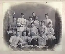The 1886 Navy football team was made up of twelve players at five unique positions. The squad consisted of five rushers, one snap-back, two fullbacks, two halfbacks, and two quarterbacks. Three of the players (both halfbacks and a rusher) had played the previous season.[5] The age of the players ranged several years due to the academy's admission policy; the school allowed for men between the ages of 14 and 18 to be admitted, which future player John B. Patton remarked made it "just a boys' school".[6]