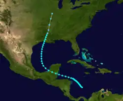 Although Fernández-Partagás and Diaz did not confirm information about this storm before September 18, they opted to retain the track back to September 12 for continuity with previous reanalyses.[10] The storm initially moved slowly northwestward and turned west-northwestward on September 14. Two days later, the cyclone moved ashore northern Belize (then known as British Honduras) and crossed southeastern Mexico before emerging into the Gulf of Mexico near Ciudad del Carmen, Campeche, early on September 17. The storm then moved mostly northward for the next few days, until curving slightly to the north-northeast on September 19 while approaching the Gulf Coast of the United States. Around 11:00 UTC on September 20, the cyclone made landfall just east of Creole, Louisiana, with winds of 60 mph (95 km/h). The cyclone is estimated to have weakened to a tropical depression near the Arkansas-Louisiana state line on September 21 and then dissipated over Illinois on September 22.[3]