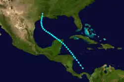 A tropical storm with winds of 60 mph (95 km/h) was first observed near Barbuda early on October 27.[4][3] The storm moved almost due west, passing through the northern Leeward Islands and then just south of Puerto Rico, Hispaniola, and Jamaica before making landfall at Ambergris Caye, British Honduras, with winds of 50 mph (85 km/h) on November 3. The system weakened as it continued westward over Mexico and dissipated on the following day near Coatzacoalcos, Veracruz.[3] Fernández-Partagás and Diaz noted that "Very little information was found about this storm" and expressed "skepticism regarding the existence and evolution of this storm".[4] Chenoweth suggests that the system dissipated a day previous to that listed officially and meandered parabolically over the western Caribbean Sea, becoming a moderate hurricane that peaked with winds of 100 mph (155 km/h) on October 31 and later struck Honduras as a strong tropical storm.[5]