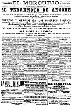 The earthquake was also felt in Santiago, the capital of Chile. The newspaper El Mercurio reported in its August 17 edition that "the earthquake was produced in a violent way since its beginning, and provoked an indescribable panic through all the four thousands of inhabitants of Santiago and an unprecedented terror in the last years. Two or three-story buildings, even the most solid ones such as the National Congress, were swinging like a vessel in the sea. The shakings were so strong that many people thought the earth was going to open itself in deep and long strips."[14]