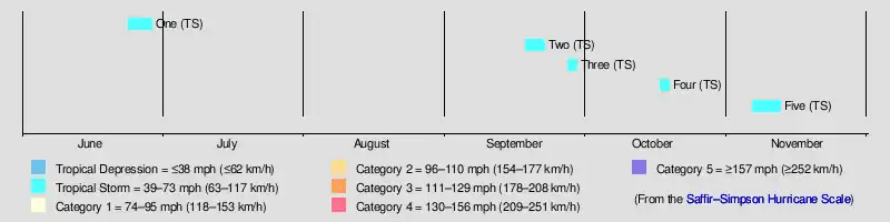 The season was one of only two Atlantic seasons without a storm of hurricane intensity (winds of 75 mph (120 km/h) or higher), the other being the 1914 season. In addition, the maximum winds recorded from the first tropical storm were also the highest of the season; it also broke the record for the weakest "most intense" storm on record for an Atlantic hurricane season.[1] Reanalysis also indicated that four additional systems could have developed during the season.[3] No deaths occurred during the season and damage was minimal.[4]