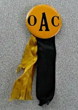 Pinback and ribbon in school colors produced for OAC football fans by a Corvallis department store