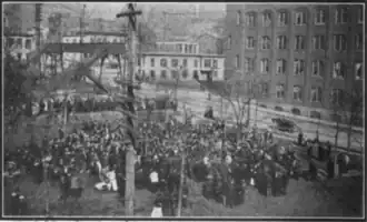Soon after the strike began, organized labor advocates and socialists from the surrounding area began to come to Little Falls to help the strikers.[40] In Schenectady, located about 55 miles (89 km) down the Mohawk River from Little Falls, Mayor George R. Lunn, a member of the Socialist Party of America, recruited many to come with him to Little Falls to help organize the strikers and recruit more textile workers to join in picketing.[40] While Mayor Lunn wished to hold a rally at Clinton Park (an area located directly across the street from the Phoenix Mill),[33] city authorities took advantage of local ordinances to bar the socialists from holding the meeting, with one ordinance requiring permits from city officials to hold a rally and another forbidding gatherings of over 20 people in public.[41] These ordinances were often enforced inconsistently, as previous political rallies by Democratic politicians William Sulzer and Martin H. Glynn had been allowed, but were invoked to prevent socialists who attempted to speak at the park.[42] Local law enforcement officials were highly sympathetic to the mill owners,[34][19] and both Herkimer County Sheriff James W. Moon and Little Falls Police Chief James "Dusty" Long stated that speeches by the socialists could possibly provoke a riot and further civil unrest.[43] Many activists who attempted to speak in favor of the strike were arrested on charges of disturbing the peace or blocking traffic,[42] including Mayor Lunn himself on October 15.[44][35][15] Lunn refused to pay a $50 fine and was sentenced to a 50-day jail sentence.[45] Regarding the strike and involvement of the socialists, Police Chief Long stated, "We have a strike on our hands and a foreign element to deal with. We have in the past kept them in subjugation and we mean to continue to hold them where they belong".[34][19] In addition to law enforcement, local media institutions were also critical of the strike, with the Little Falls Journal and Courier expressing disapproval of the workers' decision to strike, saying, "The question of whether the wages paid were starvation or not, did not, and cannot enter into the merits of the case. The employer fixed the wages that he was willing to pay, and the men were at liberty to accept the employment or not. ... There were no extraordinary conditions, no disturbances, no suffering, no distress, so far as anyone here knew".[15]