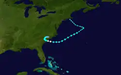 An extratropical cyclone developed offshore Rhode Island on October 2 and moved southeastward. Eventually, the system curved southwestward and transitioned into a tropical storm on October 6 while situated about 325 mi (523 km) northwest of Bermuda.[3][4] After becoming tropical, the storm continued to move southwestward and approached the Southeastern United States. By October 7, it curved westward and began to intensify. The storm became a Category 1 hurricane around 06:00 UTC on October 8. Peaking with maximum sustained winds of 75 mph (121 km/h) and a minimum barometric pressure of 989 mbar (29.2 inHg), the hurricane made landfall near McClellanville, South Carolina, about eight hours later. By the evening of October 8, the cyclone weakened to a tropical storm and fell to tropical depression intensity by late on October 9. Early the following day, it became extratropical and was soon absorbed by a strong cold front over North Carolina.[4]