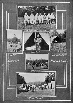 On September 8, the Pitt football aspirants started drills at Camp Hamilton, the preseason training camp at Windber, PA, under the tutelage of Coach Warner. The team will "go through a three weeks course of preparation for the strenuous season which is before them."[20] "Several holes have been left in the Blue and Gold lineup by graduation and other causes. Heil, Collins, Ward, Hanley, Cliff Morrow and Dillon are all lost from the 1914 backfield, while Smith, Reese, Jones and Healy are among those missing from the line and end positions. This gives Warner some serious problems in finding men to replace those who have left. A large part of the coach's time will be taken up by the development of the new talent."[21]