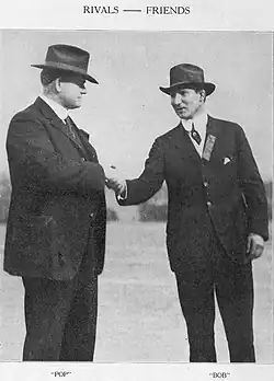 The lone scare of the 1916 season occurred at Navy when, following a delay of the team's train heading to Annapolis that caused a late arrival, the team overcame several fumbles and eked out a 20–19 victory.[2] The 1916 team was led by center Bob Peck, Pitt's first first-team All-American, and All-American end James Pat Herron, as well as All-Americans fullback Andy Hastings and guard "Tiny" Thornhill. Also on that team were Jock Sutherland and H.C. "Doc" Carlson who would go on to become perhaps Pitt's most legendary coaches in football and basketball, respectively. This Pitt Panthers football team was given the nickname "the greatest eleven in the world."[3]