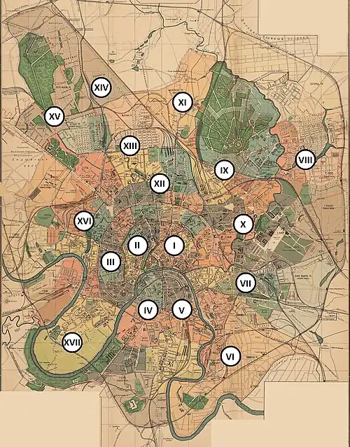 On September 4 [O.S. August 22] 1917 the Moscow City Duma adopted a resolution deciding to replace the now defunct pre-revolutionary police sectors with 17 administrative districts 'in order to organize the public city life'.[3][4] Notably, these geographic boundaries of these 17 new administrative districts did not line up with the boundaries of the 11 soviet districts that had emerged in March 1917.[3]