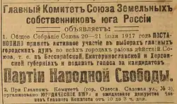 Announcement of the Union of Land Owners of South Russia calling for a vote for the People's Freedom Party (i.e. Kadets), published on front page of Odesskie Novosti