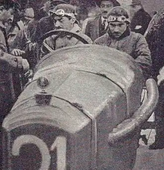 In 1915 Nicola Romeo got a majority shareholding in ALFA and merged it three years later into his group of engineering companies.[19] The Alfa Romeo 40/60 had veteran Giuseppe Campari and Nino Franchini as drivers. Among the four FIATs was Antonio Ascari in his first season of racing. There were also entries from race-regulars Itala, Diatto, Aquila Italiana and Nazzaro. New entry CMN had two cars for their drivers, Ugo Sivocci and a 21-year old Enzo Ferrari, who had already driven their cars from the factory in Milan.[20] Foreign interest was generated with the entry of René Thomas in his Ballot and André Boillot in the Peugeot L25, both now back from Indianapolis. Finally, there was the new British firm Eric-Campbell, with cars for 1912 Targa winner Cyril Snipe and Jack Scales.[5]