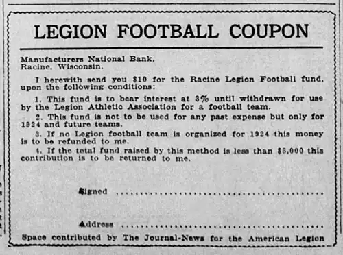Despite sponsorship funds, the Legion franchise racked up a significant deficit during 1922 and 1923 and prospects were gloomy for continuation in the National Football League for a third season unless additional funding was secured.[2] The idea was hatched by local fans to subsidize operations through the organized collection of $10 donations to the Legion Football Fund, with a goal of raising $10,000 for the 1924 season.[2] This money was to be held in trust until at least $5,000 was raised or a 1924 football team assured with a May 15, 1924, deadline.[2] Money collected in conjunction with the campaign was to be used to cover future expenses rather than for the purposes of retiring the post's debt.[2] The local daily newspaper, the Racine News-Times, donated advertising space to help raise the profile of the fundraising effort.[2]