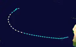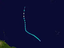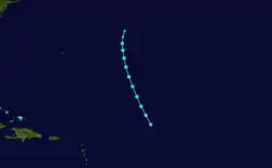A low pressure area developed into a tropical storm about 835 mi (1,345 km) east-northeast of Barbuda early on September 23.[4][5] The system moved northwest, and by 12:00 UTC on September 24, it strengthened into a Category 1 hurricane. Late on September 25, the cyclone intensified into a Category 2 hurricane. A ship recorded a pressure of 971 mbar (28.7 inHg) on September 26. Because this was measured within the storm's radius of maximum sustained winds, the hurricane's minimum barometric pressure was estimated to have been 967 mbar (28.6 inHg). Based on the pressure-wind relationship, the system peaked with maximum sustained winds of 110 mph (175 km/h). Thereafter, it curved northeastward on September 27, shortly before weakening to a Category 1 hurricane. Early on September 28, the hurricane became extratropical about 360 mi (580 km) south-southeast of Sable Island. However, the extratropical storm existed until October 1, when it dissipated well north of the Azores.[5]