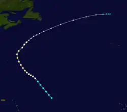 A tropical storm developed from a tropical wave over the deep tropics of the Atlantic Ocean on August 18.[4] Moving west-northwestward, it intensified into a Category 1 hurricane on the modern day Saffir–Simpson hurricane wind scale by August 19. The storm deepened significantly over the next few days, and by August 22, it peaked as a Category 3 hurricane with sustained winds of 125 mph (205 km/h) and a minimum pressure of 950 mbar (28 inHg).[5] The latter was observed by the S.S. Maraval, while the former was estimated using the pressure-wind relationship.[4] Around that time, the system began curving northwestward and later northward. By August 23, it turned to the north-northeast and then began weakening on August 24. Thereafter, the storm accelerated toward Atlantic Canada. Late on August 24, the hurricane struck near Yarmouth, Nova Scotia, as a Category 2 hurricane, just before becoming extratropical. The remnants continued northeastward, striking Newfoundland and later Iceland, before dissipating near Jan Mayen on August 29.[5]
