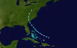 At approximately 12:00 UTC on September 30,[5] a low pressure area developed into a tropical depression while situated about 175 mi (280 km) northeast of Turks and Caicos Islands.[4] The depression moved parallel to the islands of the Bahamas and slowly strengthened, reaching tropical storm status early on October 2.[5] Continuing its northwestward motion, the storm strengthened further and peaked early on October 3 with maximum sustained winds of 60 mph (95 km/h) and a minimum barometric pressure of 1,008 mbar (29.8 inHg),[5] the latter of which was a ship observation.[4] Around 09:00 UTC, the cyclone made landfall near Beaufort, South Carolina, at the same intensity. The storm curved northward after moving inland and weakened to a tropical depression early on October 4. Several hours later, the system dissipated over West Virginia.[5]