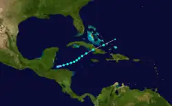 The season's next cyclone developed from over the northwestern Caribbean Sea from a broad low pressure area near the Bay Islands Department of Honduras on October 16.[4][5] Moving east-northeastward, the system strengthened into a tropical storm several hours later.[5] Early on October 17, the system peaked with winds of 45 mph (75 km/h), based on a ship observation of a minimum barometric pressure of 999 mbar (29.5 inHg).[4] Curving northeastward, it made landfall near Santa Cruz del Sur, Camagüey Province, late on October 18 at the same intensity. After crossing Cuba, the storm accelerated and moved through the Bahamas early the following day, striking the island of Acklins. By 06:00 UTC, the system was absorbed by a cold front while located about 105 mi (170 km) north-northeast of Mayaguana.[5]