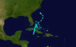 A weak low pressure area developed into the seventh storm of the season formed near the Cayman Islands on October 30.[4][5] Initially a tropical depression, it tracked slowly north-northeastward and reached tropical storm status about six hours after forming. Early on October 31, the storm peaked with maximum sustained winds of 45 mph (75 km/h), several hours before making landfall in Sancti Spíritus Province several hours later. After emerging over the Bahamas, the storm slowly weakened. Late on November 1, the system struck Andros Island with winds of 40 mph (65 km/h). Thereafter, the cyclone accelerated and continued weakening, falling to tropical depression intensity late on November 3. Shortly thereafter, it transitioned into an extratropical cyclone while located about 215 mi (345 km) south of Cape Hatteras, North Carolina.[5]