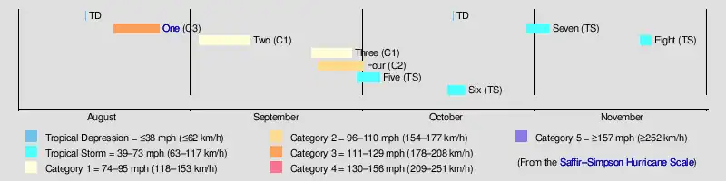 The season's activity was reflected with an accumulated cyclone energy (ACE) rating of 56,[1] below the 1921–1930 average of 76.6.[3] ACE is a metric used to express the energy used by a tropical cyclone during its lifetime. Therefore, a storm with a longer duration will have high values of ACE. It is only calculated at six-hour increments in which specific tropical and subtropical systems are either at or above sustained wind speeds of 39 mph (63 km/h), which is the threshold for tropical storm intensity. Thus, tropical depressions are not included here.[1]