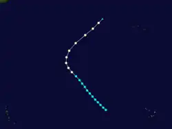 The final cyclone of the season developed about 740 mi (1,190 km) west-northwest of the easternmost islands of Cape Verde on October 10. Moving north-northwest, the system maintained intensity on October 11, before beginning to intensify more rapidly on October 12. Early the next day, it strengthened into a Category 1 hurricane and peaked with maximum sustained winds of 90 mph (140 km/h). After turning northeastward, the hurricane weakened to a tropical storm on October 14. Around 06:00 UTC on October 15, the cyclone transitioned into an extratropical cyclone while situated approximately 285 mi (459 km) northwest of Flores Island in the Azores.[4]