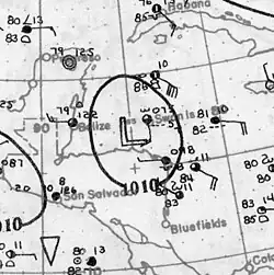 A tropical storm formed on September 1 just south of Hispaniola. Moving just north of due west, the system brushed the south coast of Jamaica as a 40 mph (64 km/h) tropical storm on September 2 before slowly beginning to intensify on September 3. The strengthening tropical storm reached its peak of 60 mph (97 km/h) on September 4 shortly before making landfall on the Yucatan Peninsula near Playa del Carmen near its peak intensity early on September 5. The system deteriorated after crossing the peninsula and entering the Bay of Campeche early on September 6 as a weak tropical storm. Later, the storm restrengthened slightly to winds of 50 mph (80 km/h) while nearing mainland Mexico on September 7. The tropical storm then weakened slightly shortly before making landfall north of Tampico early on September 8 as a weak 40 mph (64 km/h) tropical storm. After moving inland, the system weakened quickly to a depression and dissipated.[4] The storm brought 2.18 in (55 mm) of rain to Brownsville, Texas.[18]