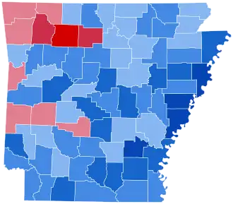 Senator Robinson's uniquely successful appeals ensured that overwhelmingly white counties in Arkansas remained at least relatively loyal to Smith, although Hoover did win eight counties that went for John W. Davis in 1924. On the whole, Arkansas’ voting was erratic outside of the black-belt counties where the white minority that did vote remained overwhelmingly loyal to Smith.[13] Hoover was the first ever Republican victor in Carroll County, Hot Spring County and Polk County, whilst he was the first Republican since Ulysses S. Grant to carry Sebastian County and Washington County.[14]