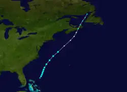 On August 23, another tropical storm was observed north of Puerto Rico. It moved northwestward for three days, slowly strengthening as it moved over the open ocean. The storm turned to the northeast and reached peak sustained winds of 50 mph (80 km/h) a short distance to the west of Bermuda. It began weakening shortly thereafter, and on August 30 the storm became extratropical to the southeast of Newfoundland. It continued to the northeast and was last observed on August 31 over the north-central Atlantic Ocean. It did not cause significant effects on land.[10][17]