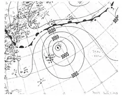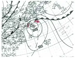 A tropical wave ascended to tropical storm status by 06:00 UTC on September 28 while located about 230 mi (370 km) south of Bermuda.[7] It moved northwest and then west-northwest, steadily organizing to attain peak winds of 65 mph (100 km/h) early on September 30. The storm then moved ashore the central coast of Maryland and was last distinguishable near Williamsport, Pennsylvania, around 00:00 UTC on October 2.[8] Considerable damage to crops, and lesser damage to structures, was inflicted throughout the Norfolk and Cape Charles, Virginia, areas, with damage estimated at $20,000.[10] Rainfall was generally light, peaking at 4.6 in (117 mm) in Diamond Springs,[9] but did result in some street flooding. A small ship and several small boats were sunk. Atlantic City, New Jersey, reported a maximum gust of 70 mph (113 km/h), and only slightly weaker gusts were recorded throughout Virginia. One death was reported.[10]